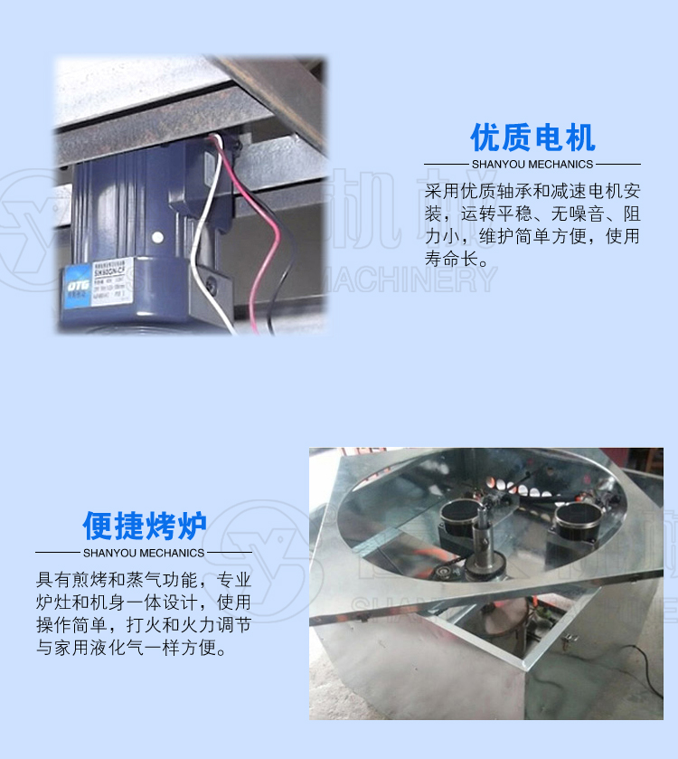 电动燃气锅巴馒头机(又称锅巴馍馍机)是广州善友机械设备有限公司专门针对现做现卖锅巴馒头和五谷杂粮馒头最新研发新型食品机械,本机外形美观豪华,清洗方便,带有活动轮子和可调节脚垫(杯),移动灵活,固定平稳。具有煎烤和蒸汽功能,接上液化气插上电源即可制作,该燃气锅巴馒头机集蒸、烤为一体,使馒头得以蒸烤结合,内嫩底酥,底面金黄、甜而不腻、外形美观;采用优质轴承和减速电机安装,运转平稳、无噪音阻力小、维护简单方便,使用寿命长.